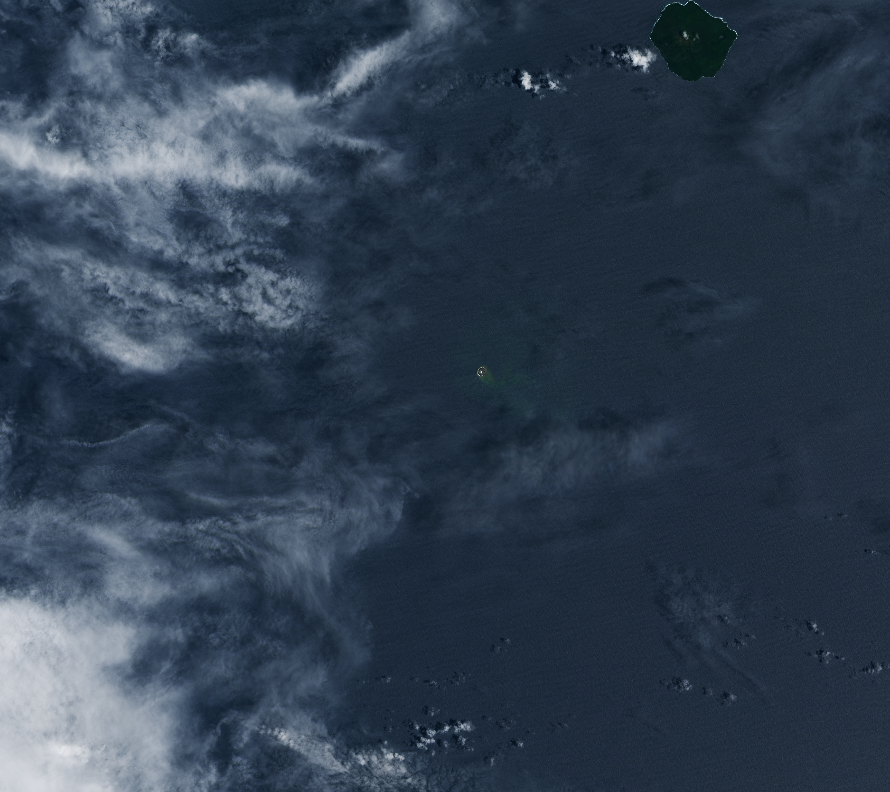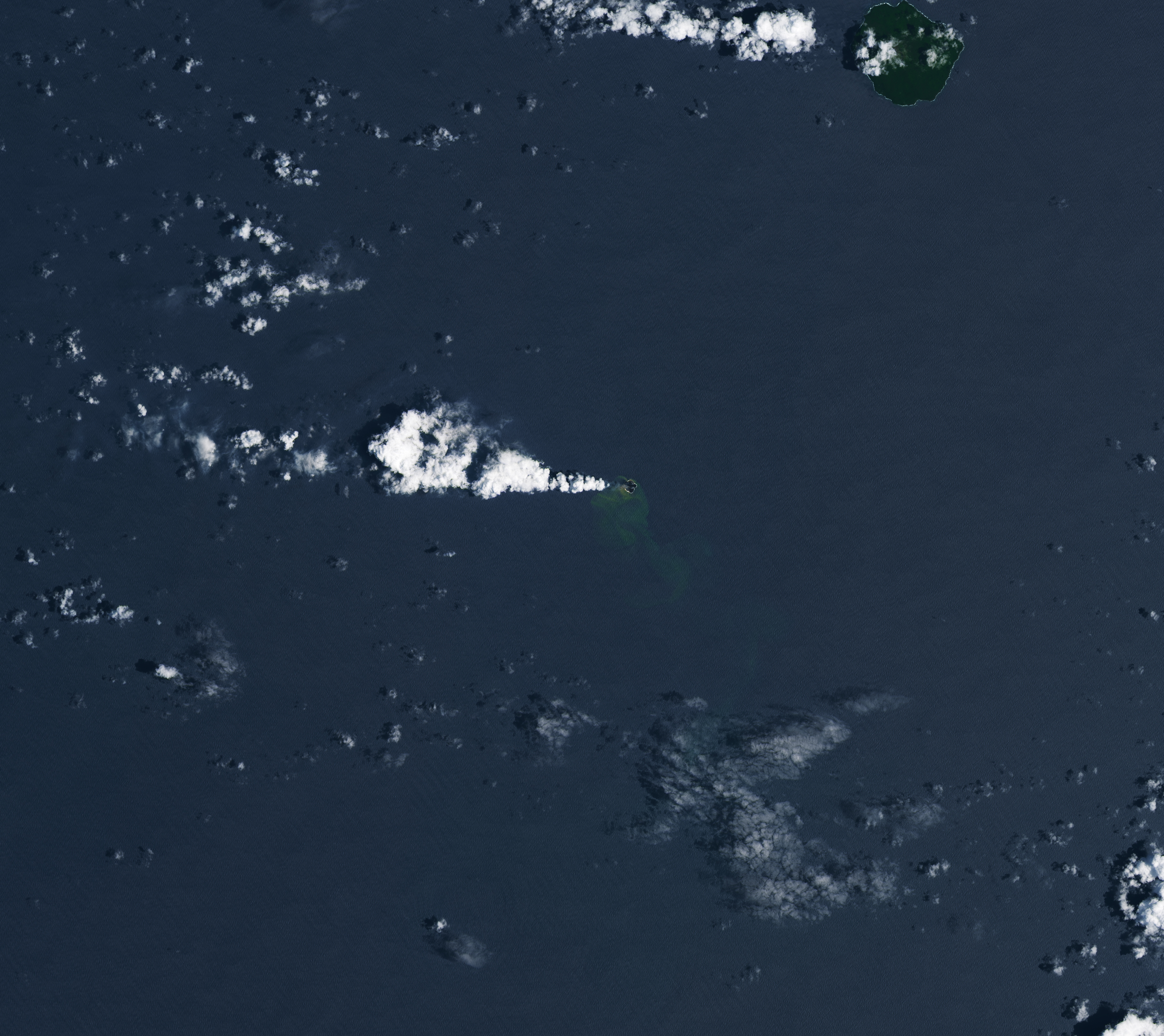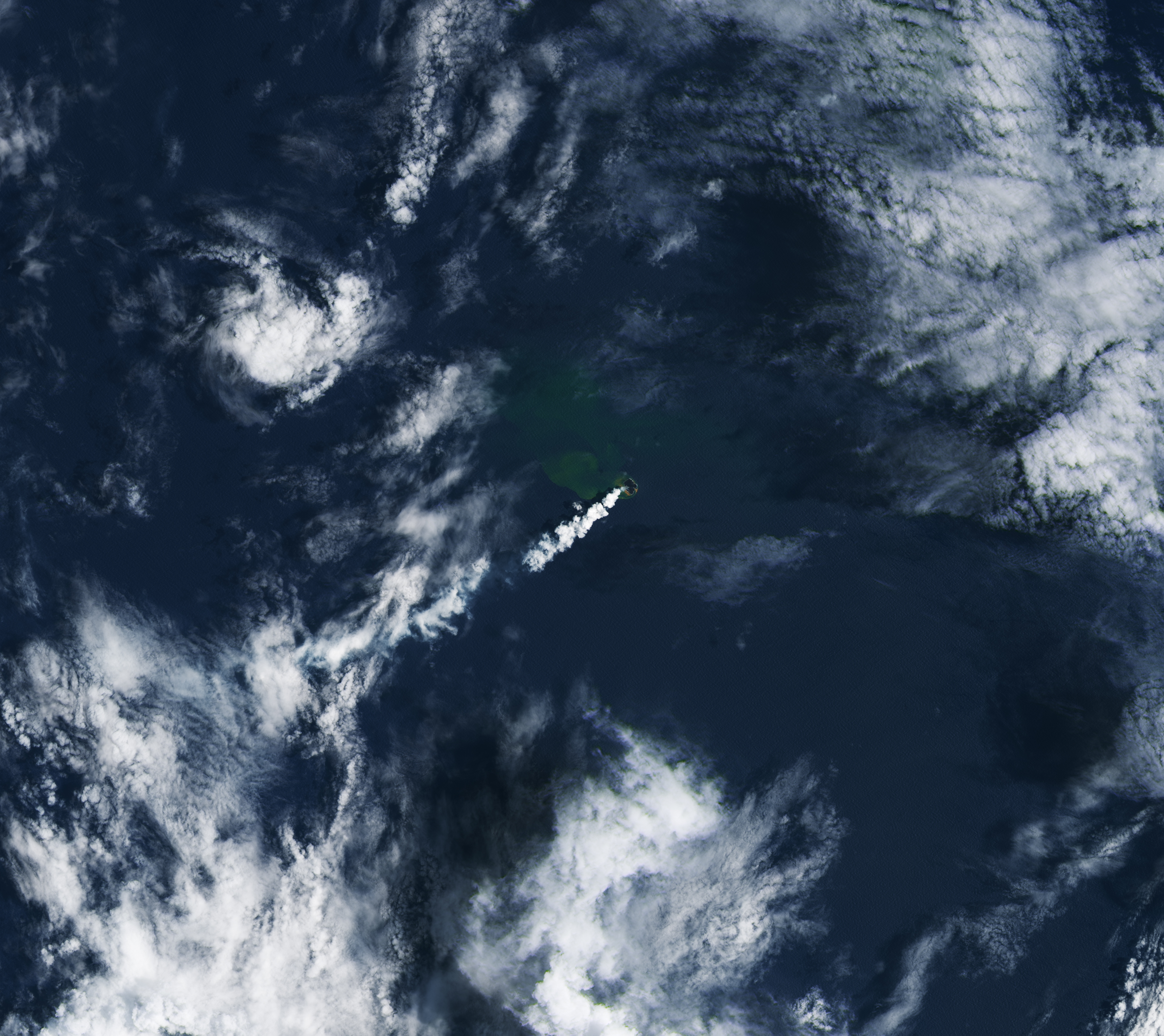 The discolored water around the island is a sign of gases and magmatic fluids venting from the volcano. Previous research has shown that such plumes of superheated, acidic water can contain particulate matter, volcanic rock fragments, and sulfur, and that they can appear before signs of an eruption above the surface. Concentrations of yellow sulfur mixing with the blue ocean may account for the water’s greenish appearance.